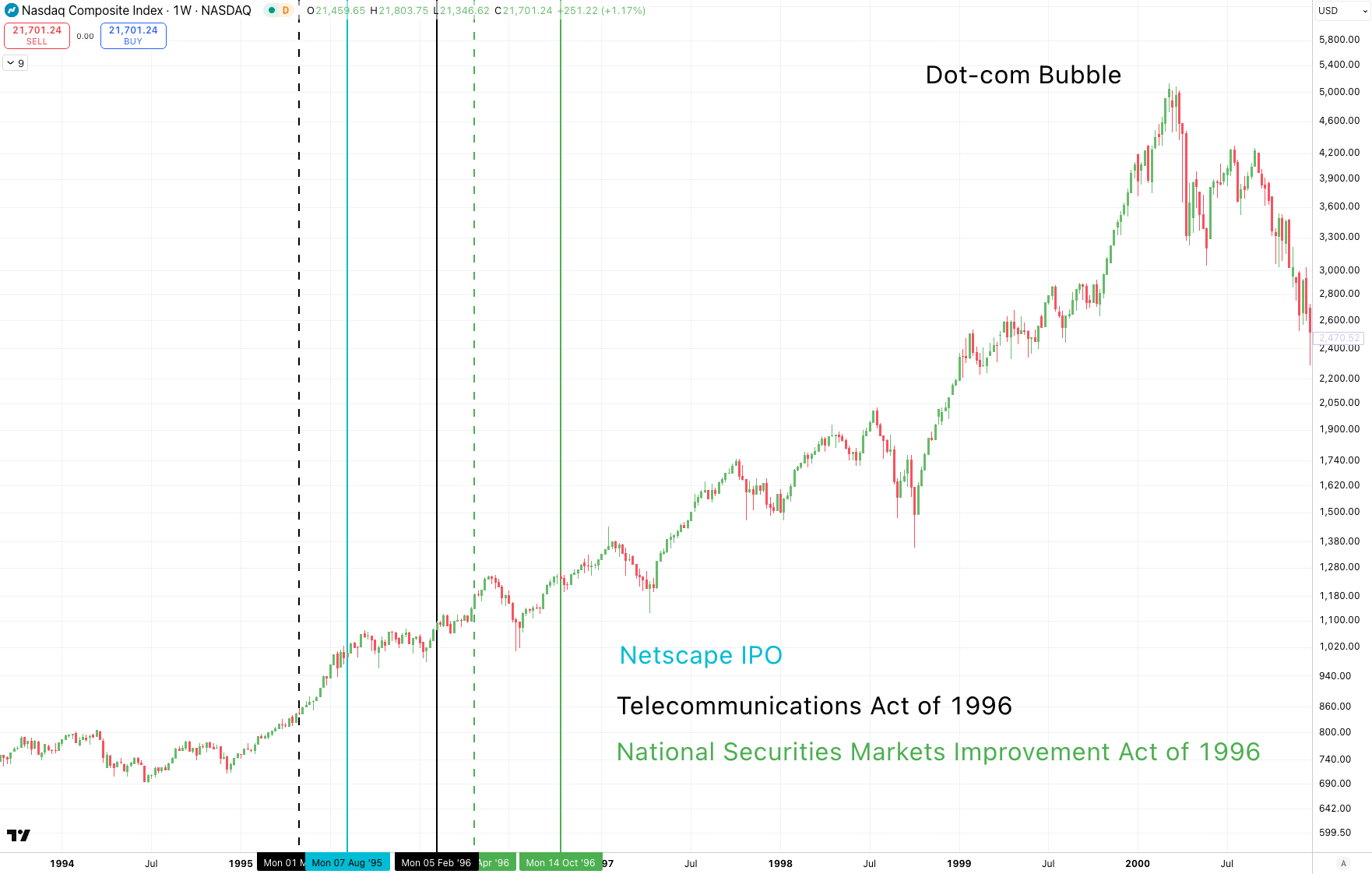 We shouldn't need to look at a chart to know what happened next... But when we draw these three key moments - Netscape IPO, Telecommunications Act, and NSMIA on a chart, it helps us to understand how they acted as a catalyst for the market. The dotted lines represent when the respective Acts were originally introduced in Congress