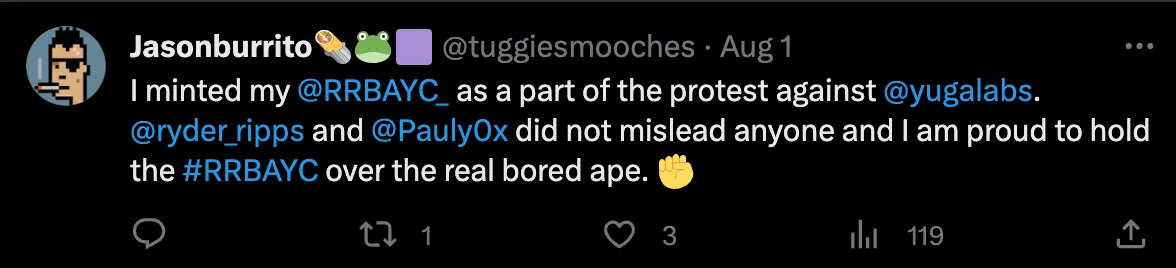 Trying to recall those times, I don’t remember the Bored Ape community being as loyal and united, supporting the brand as Ryder Ripps and Pauly’s supporters were. The latter was way more loud, bold, and passionate compared to the Bored Ape holders.