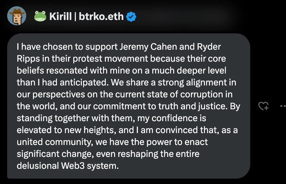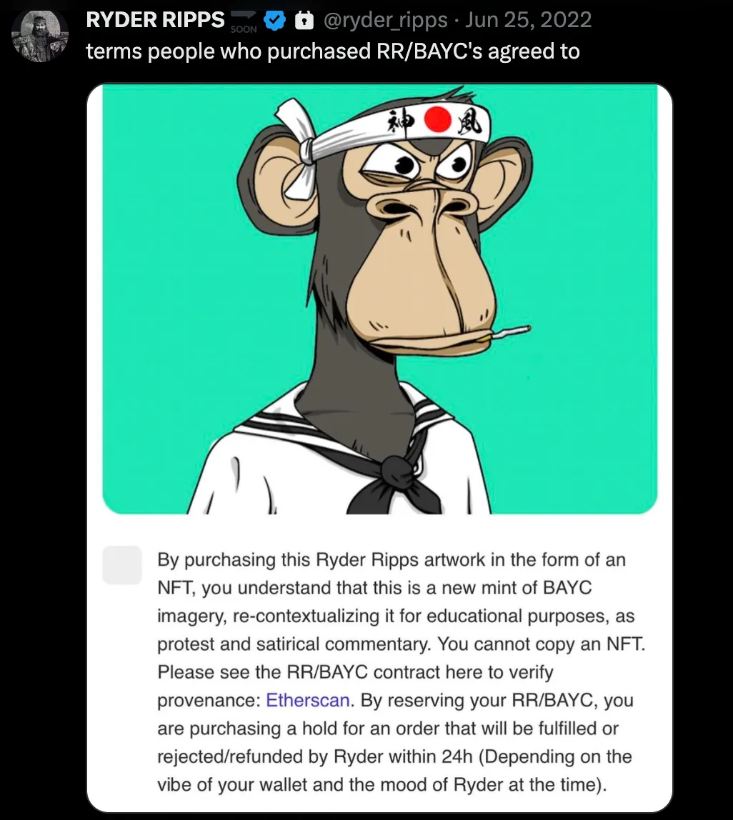As you can see from the terms, Ryder meant to re-conceptualize the BAYC imagery for educational purposes, as protest and satirical commentary.