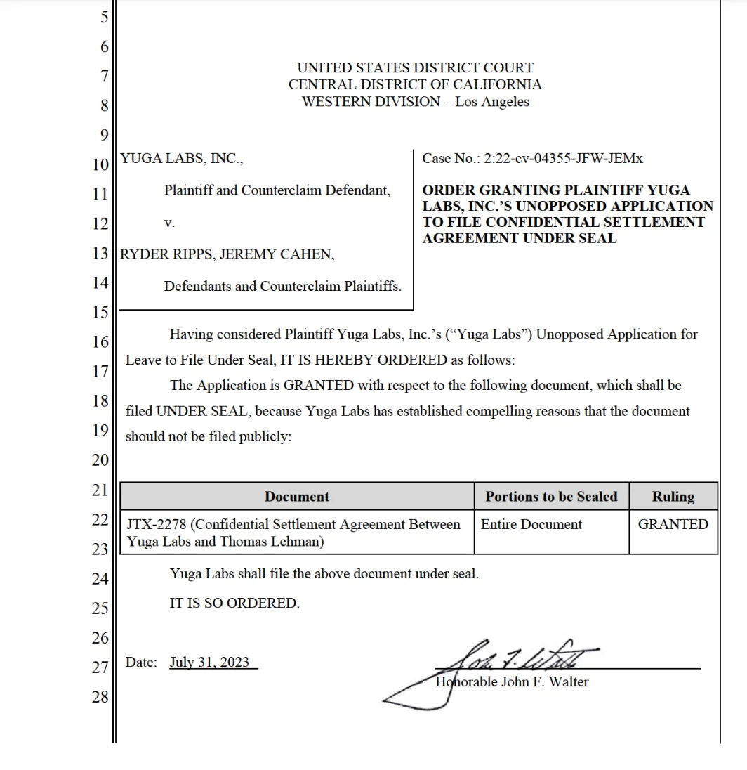 In January 2023, Yuga filed a complaint against Thomas Lehman, focusing on his role in coding and developing the RR BAYC contract and the rrbayc.com site. In February, they reached a settlement (source: Coindesk).