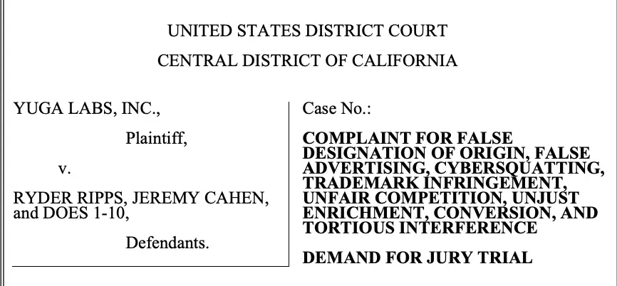 Yuga Labs sued Ryder Ripps, Pauly (Jeremy Cahen), and DOES 1-10 in June 2022.