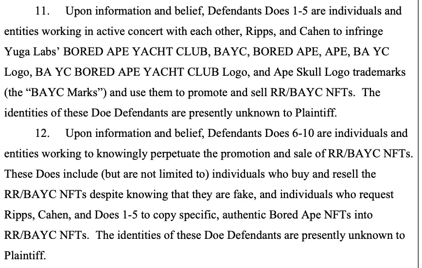 Defendants Does 6-10 have joined Ripps, Cahen, and Does 1-5 in acting to devalue authentic Bored Ape NFTs through their participation in social media in promoting the RR/BAYC NFTs while knowing them to be fake. Their specific actions will be alleged when and if their identities are ascertained.
