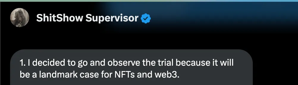 I was shocked that Nicole Munoiz (x CEO of Yuga Labs) didn’t even know her own company’s terms . The way certain YUGA witnessed lied on the stand and then we’re quickly reminded of their lies via their deposition was insane. I can’t believe it. It was embarrassing. They really shamed themselves that day.