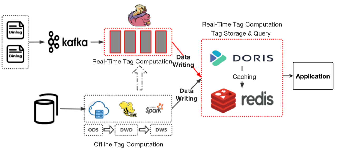 As a solution, we replaced HBase and Spark with Apache Doris, a real-time analytic database, and moved part of the computational logic of the foregoing wide-time-range real-time tags from Flink to Apache Doris.