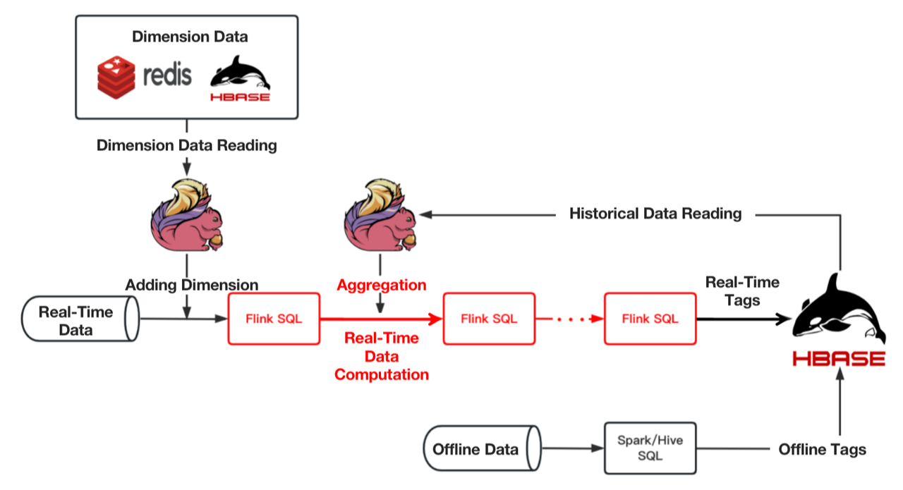 Previously, our offline tags were produced by the data warehouse, put into a flat table, and then written in HBase, while real-time tags were produced by Flink, and put into HBase directly. Then Spark would work as the computing engine.
