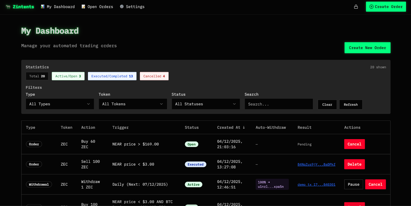 - Conditional limit orders — place ZEC/NEAR/stablecoin orders based on triggers (BTC price, market cap), with automatic payout to shielded Zcash.